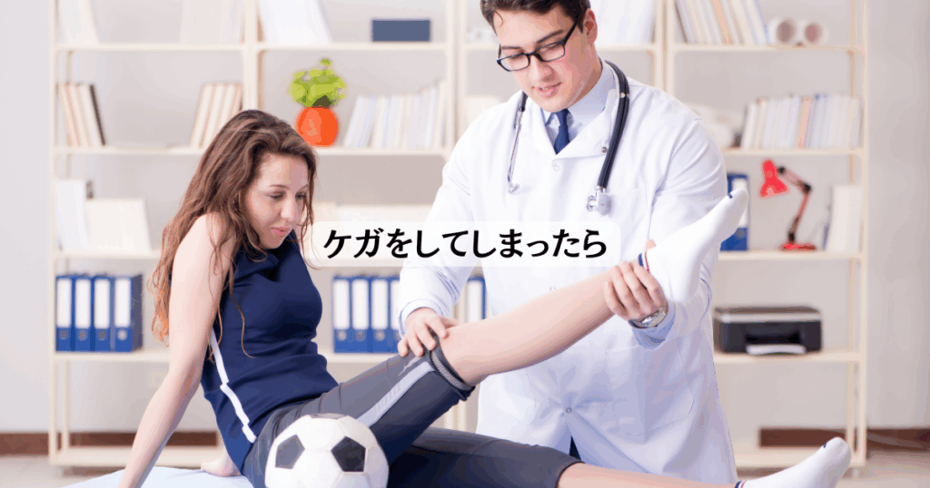ケガが発生してしまったら、応急処置を行って基本的には自分で判断をせず専門家に診てもらってください。病院などですね。